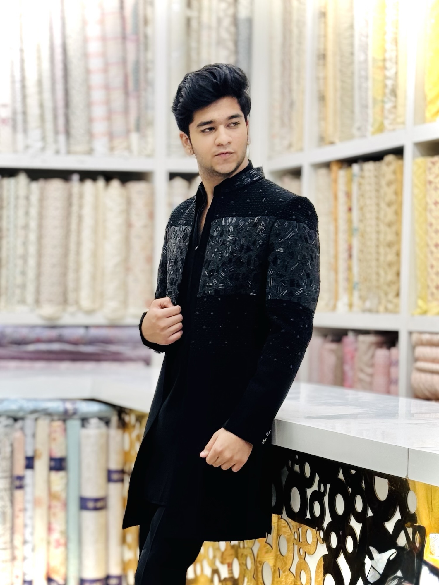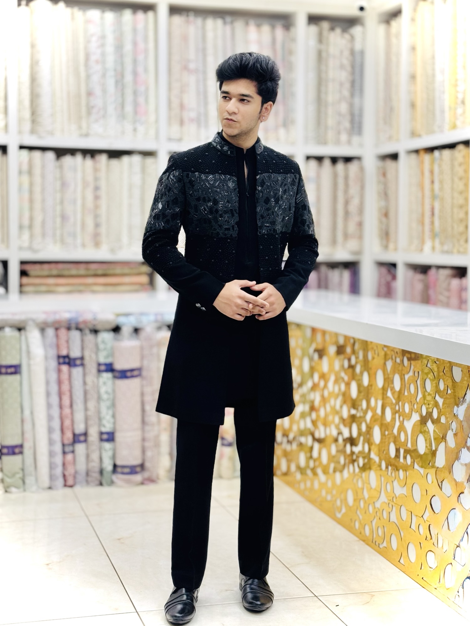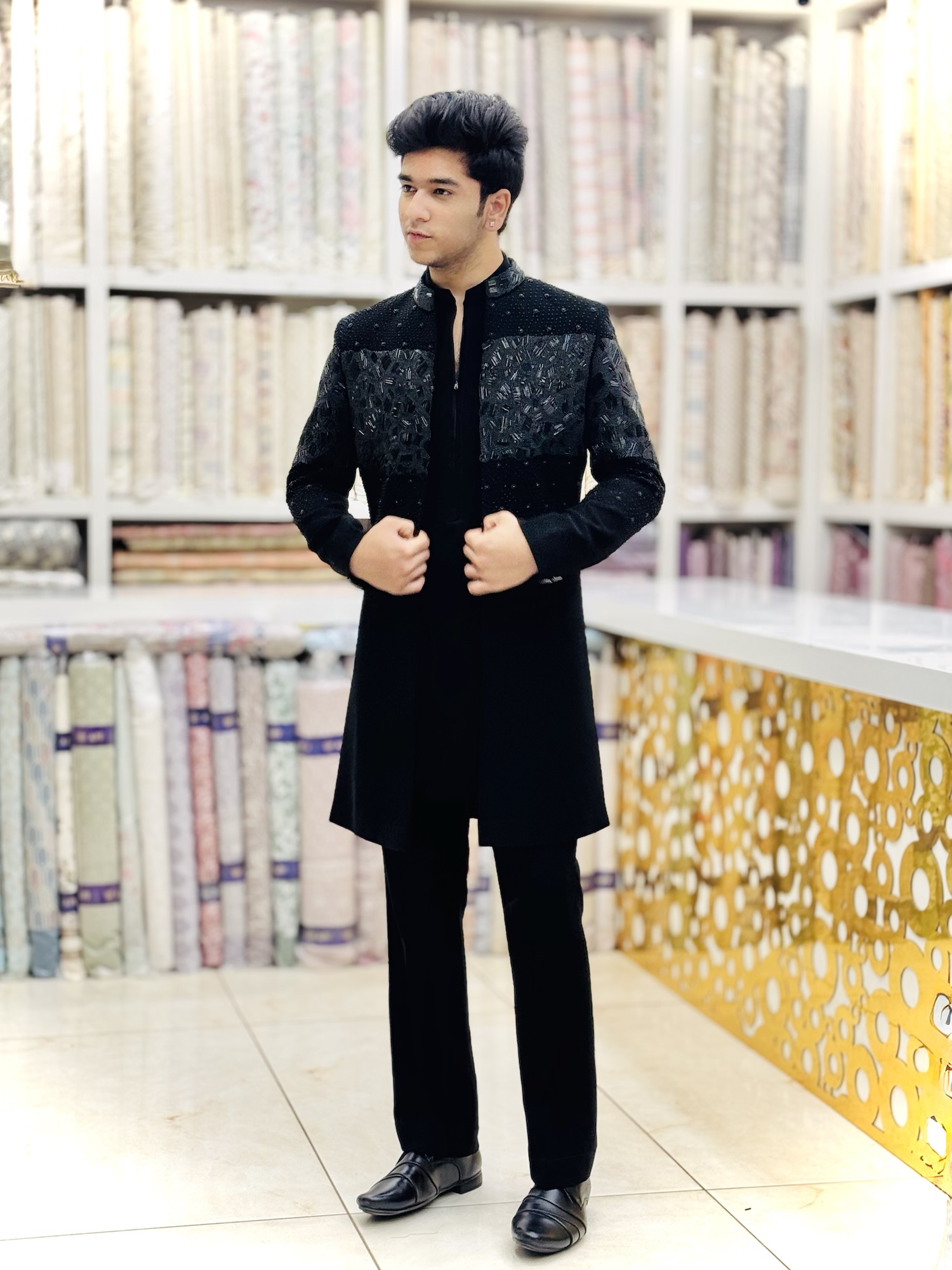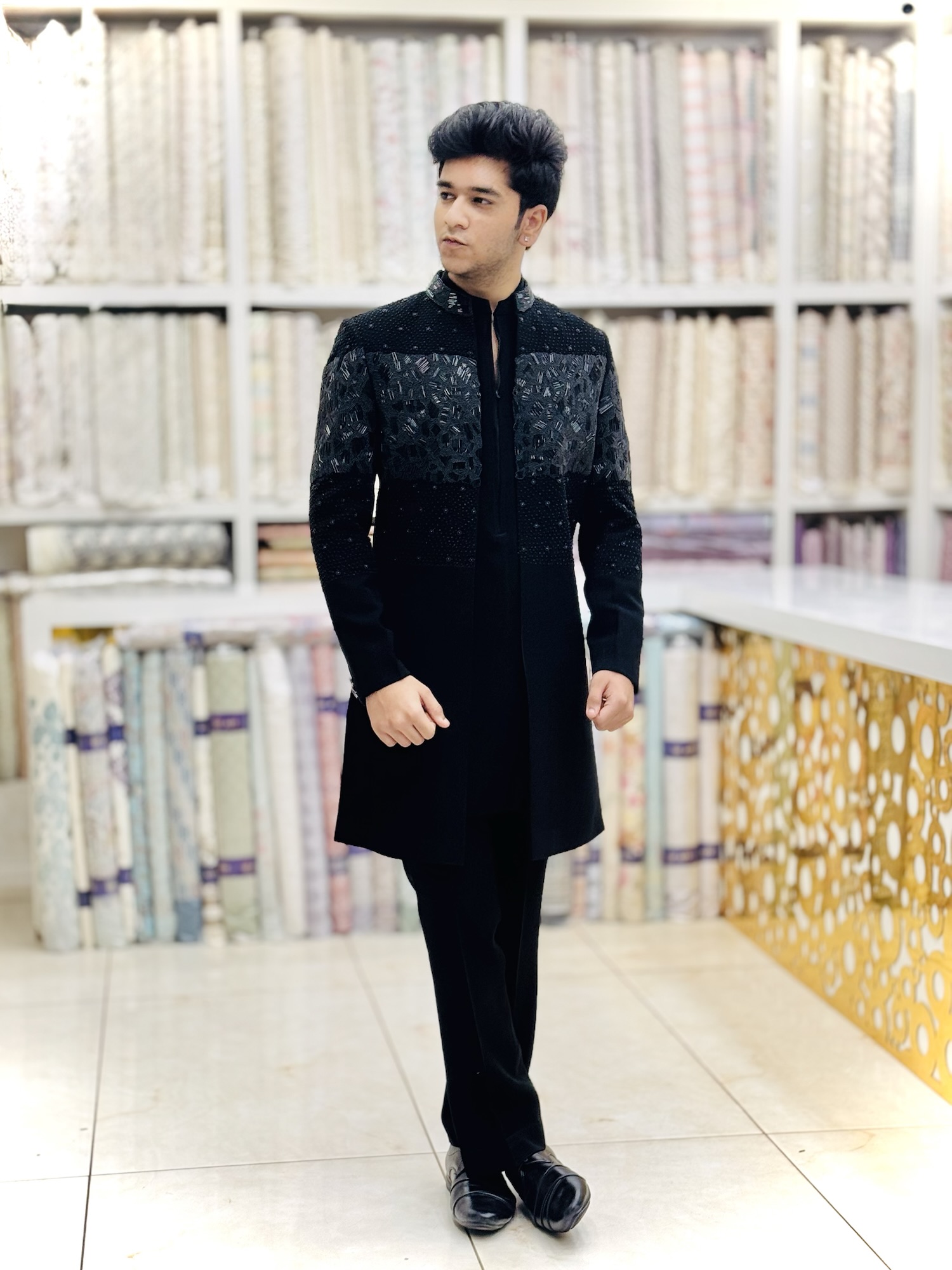 all black hand-embroidered indowestern