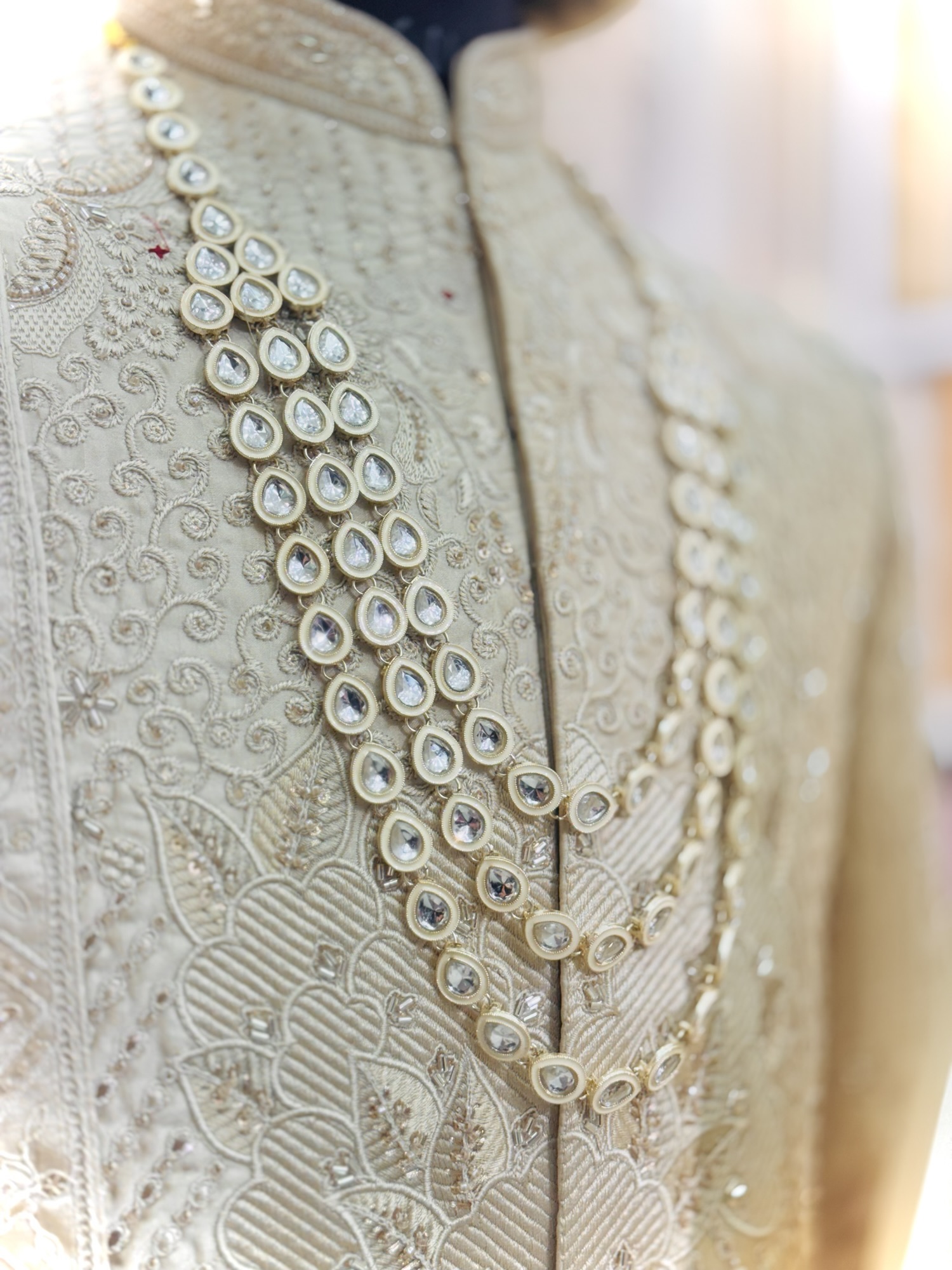 Material : embroidered sherwani , silk pajama , silk shawl , cotton silk safa , moti mala , embroidered mojdi .
