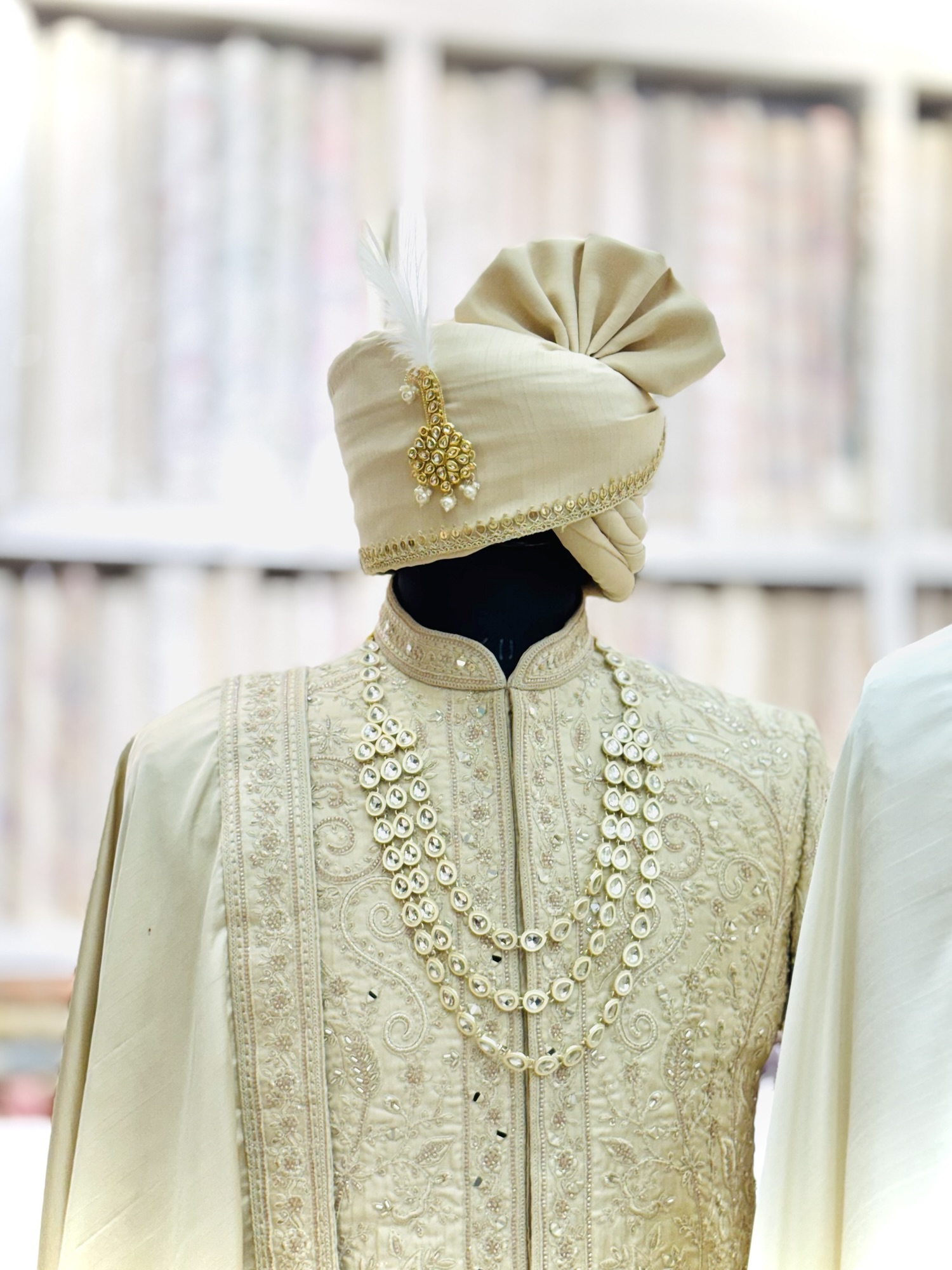 Included things : Sherwani , pajama , shawl , safa with brooch , mala , mojdi .