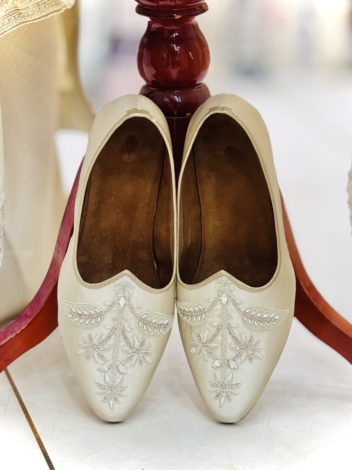 Material : embroidered sherwani , silk pajama , silk shawl , cotton silk safa , moti mala , embroidered mojdi .