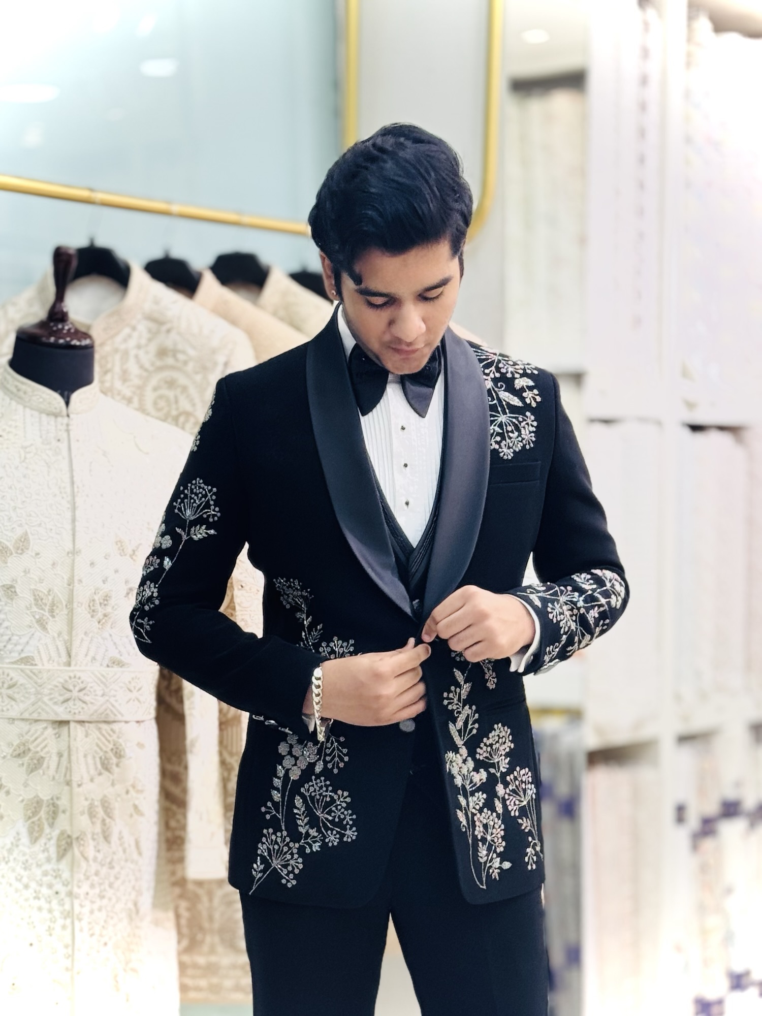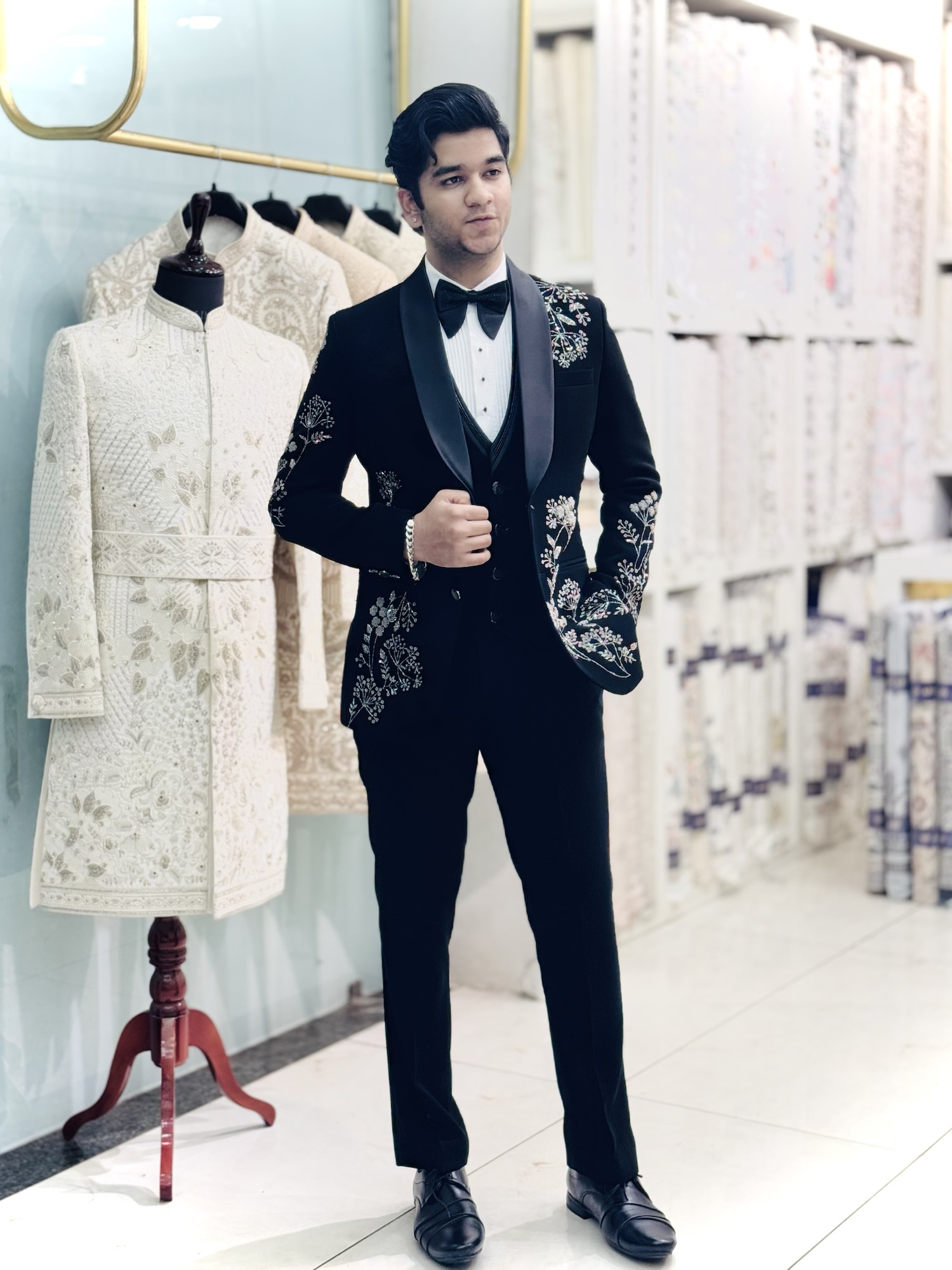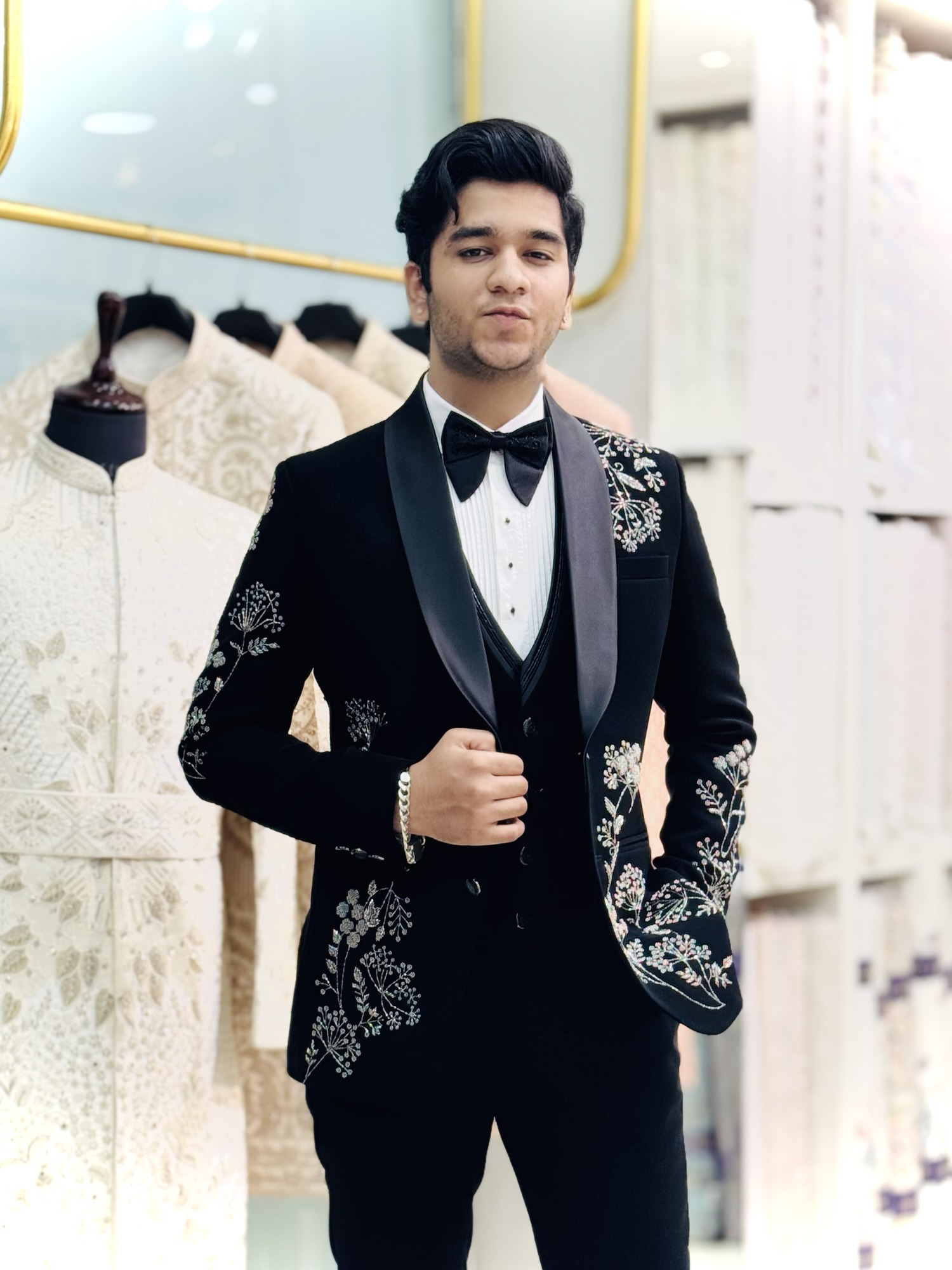 Material : imported suit , imported waistcoat , cotton tuxedo-shirt , imported pent , handworked bow-tie .