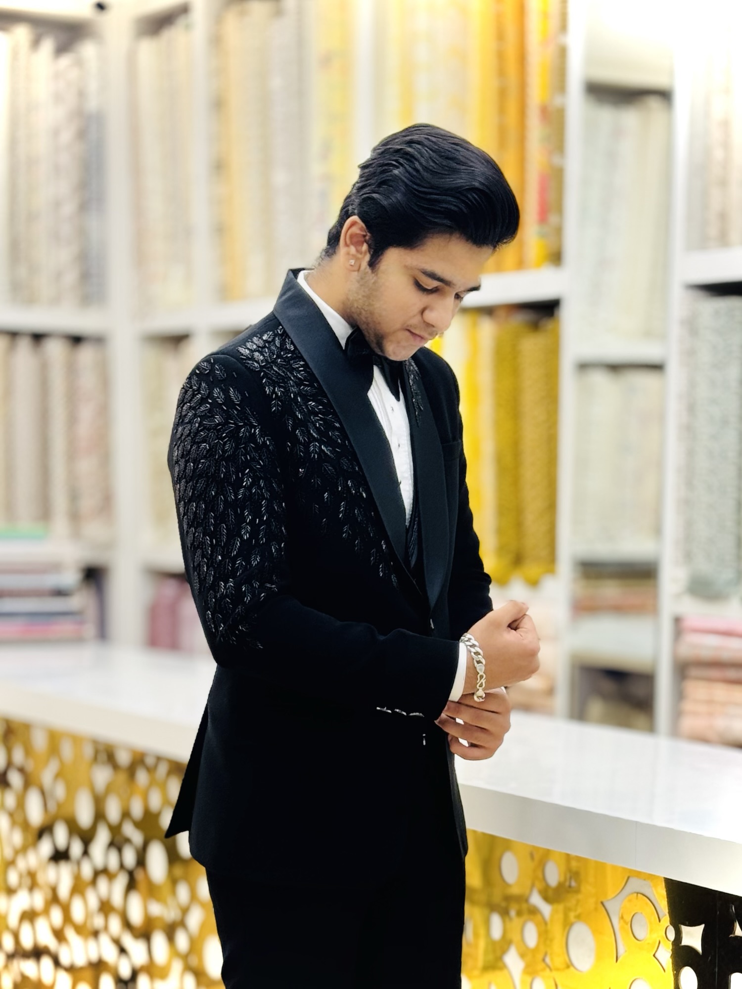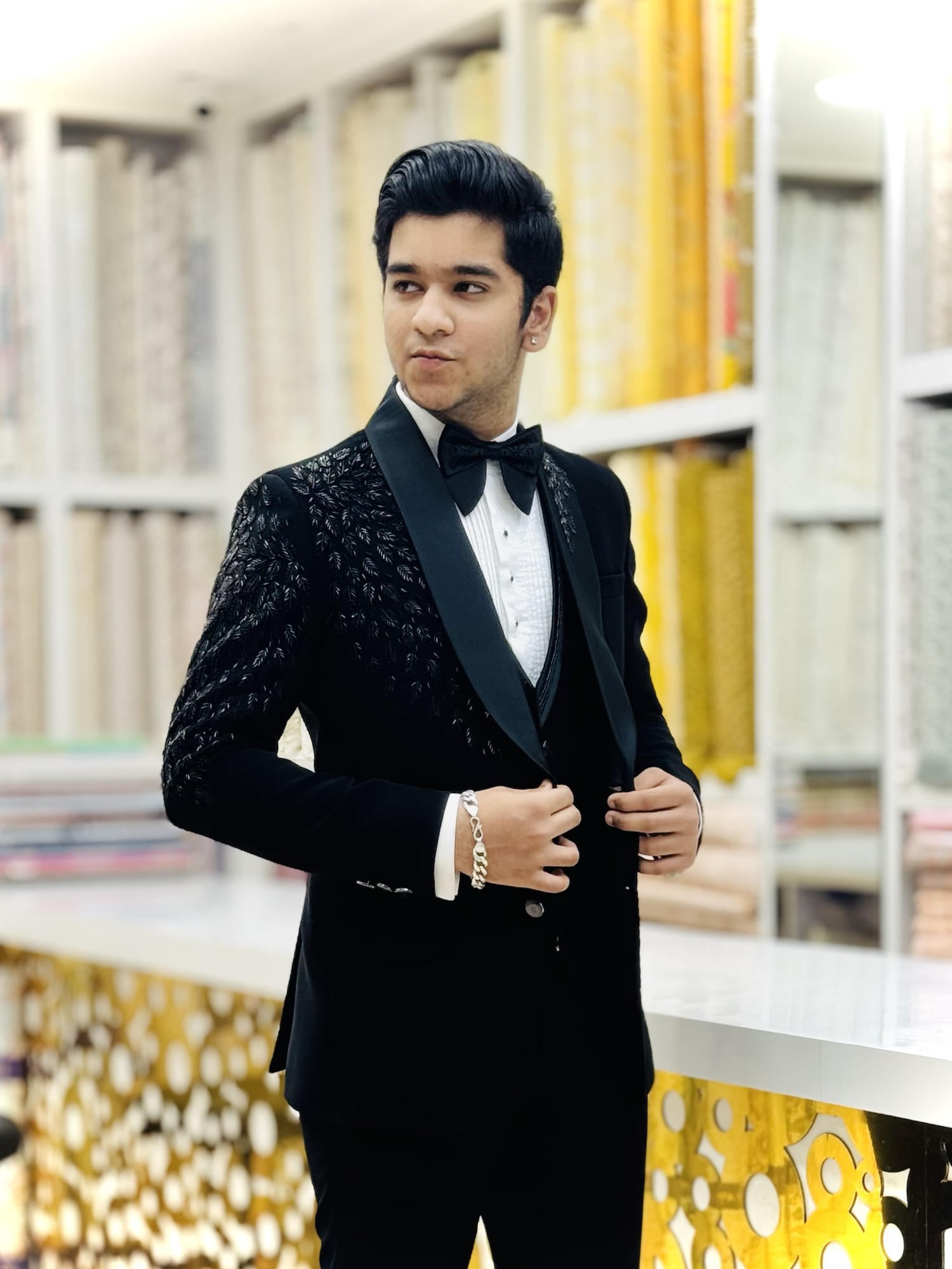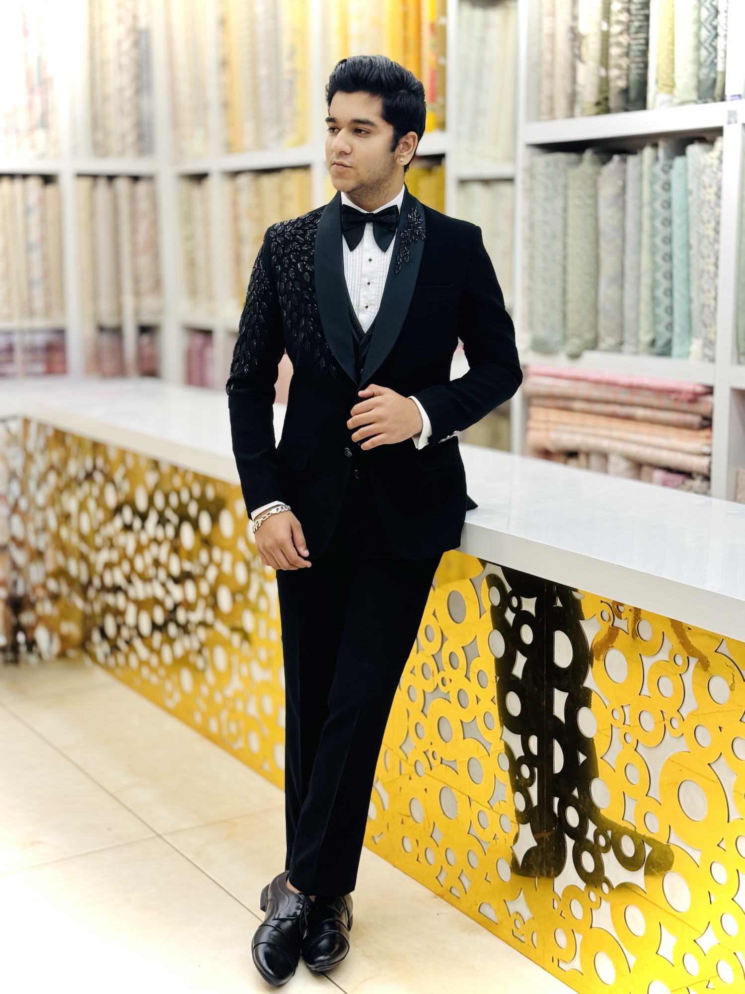 Material : imported suit , imported waistcoat , cotton tuxedo-shirt , imported pent , handworked bow-tie .