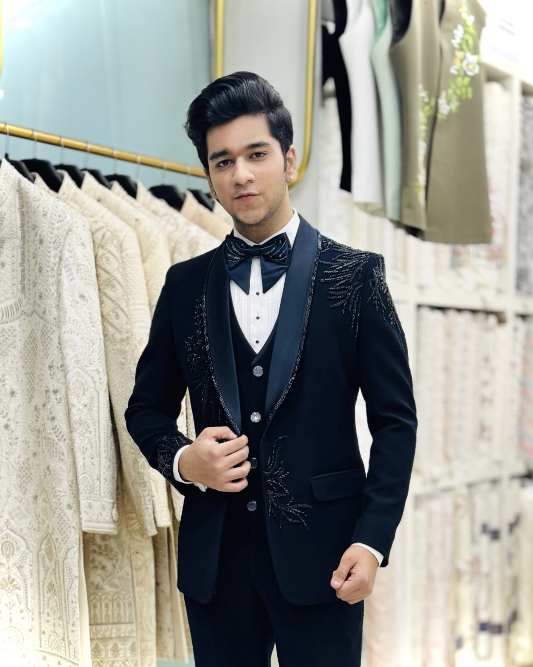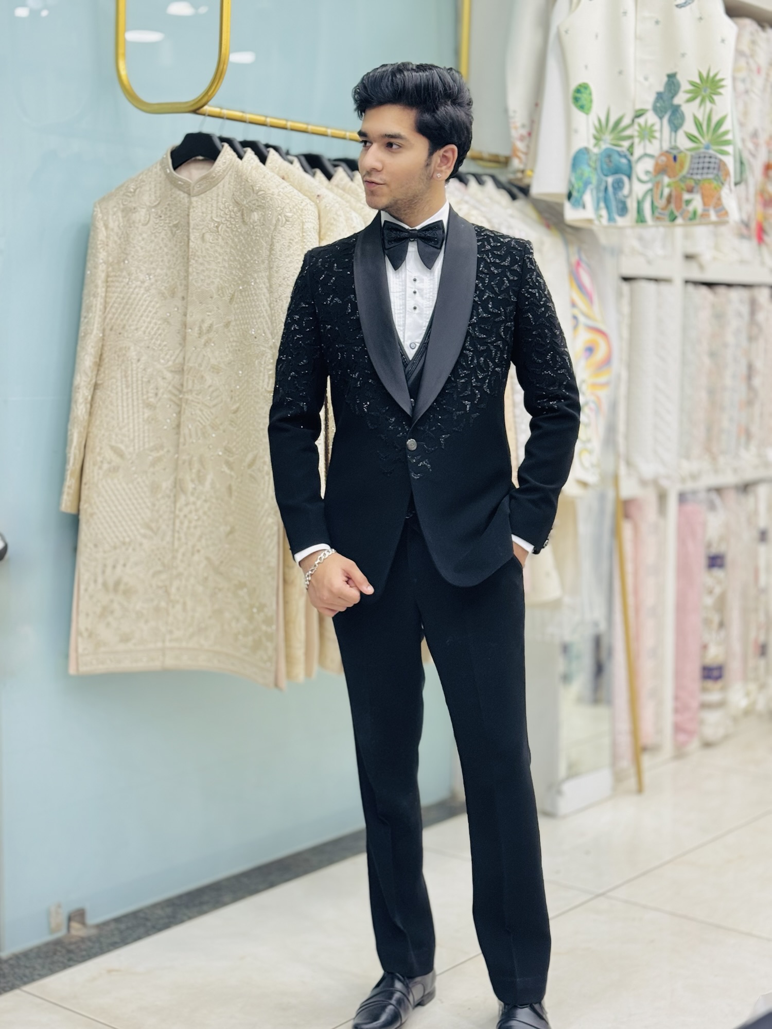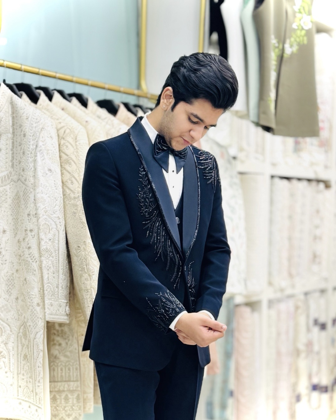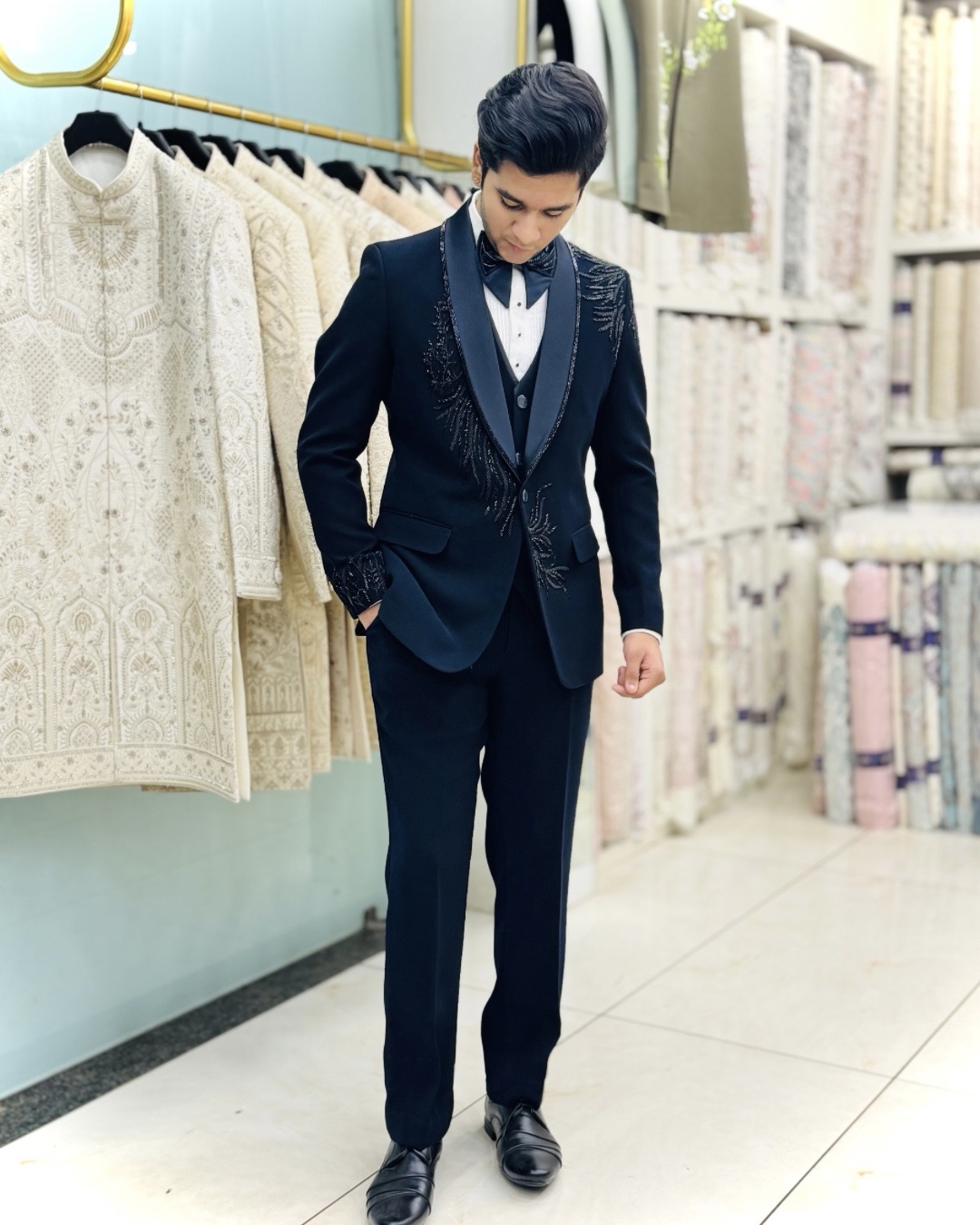 Material : imported suit , imported waistcoat , cotton tuxedo-shirt , imported pent , handworked bow-tie .