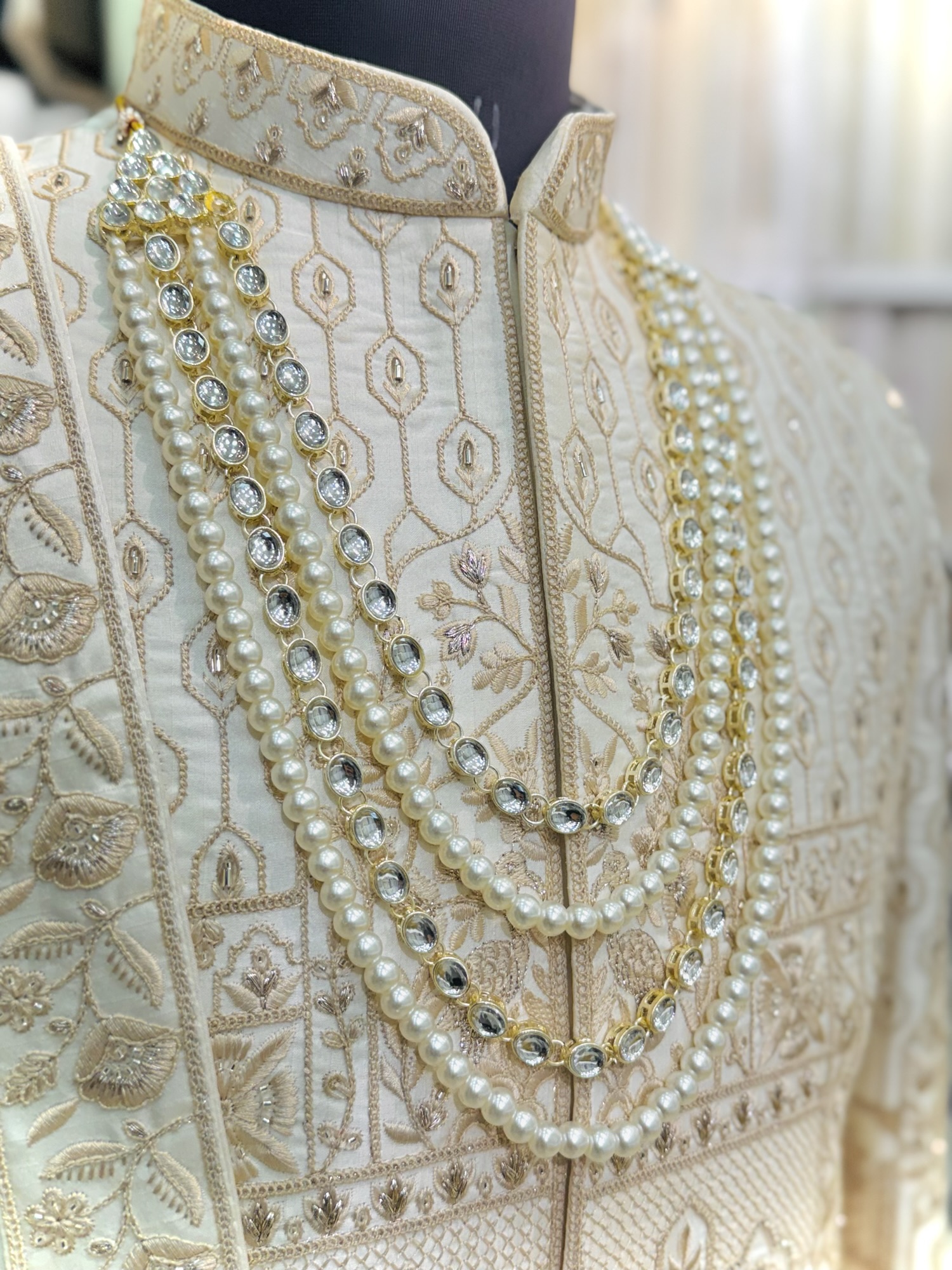 Material : embroidered sherwani , silk pajama , silk shawl , cotton silk safa , moti mala , embroidered mojdi .