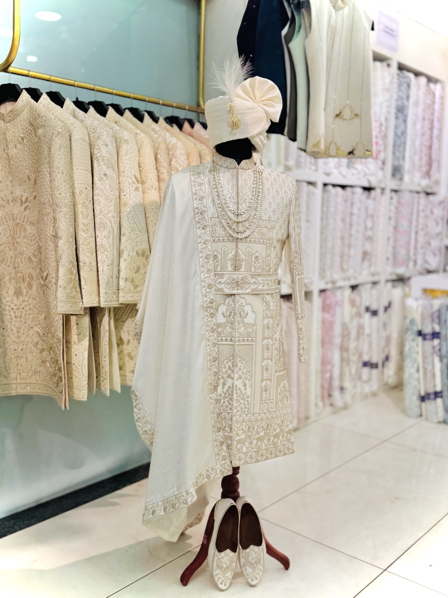 Included things : Sherwani , pajama , shawl , safa with brooch , mala , mojdi .