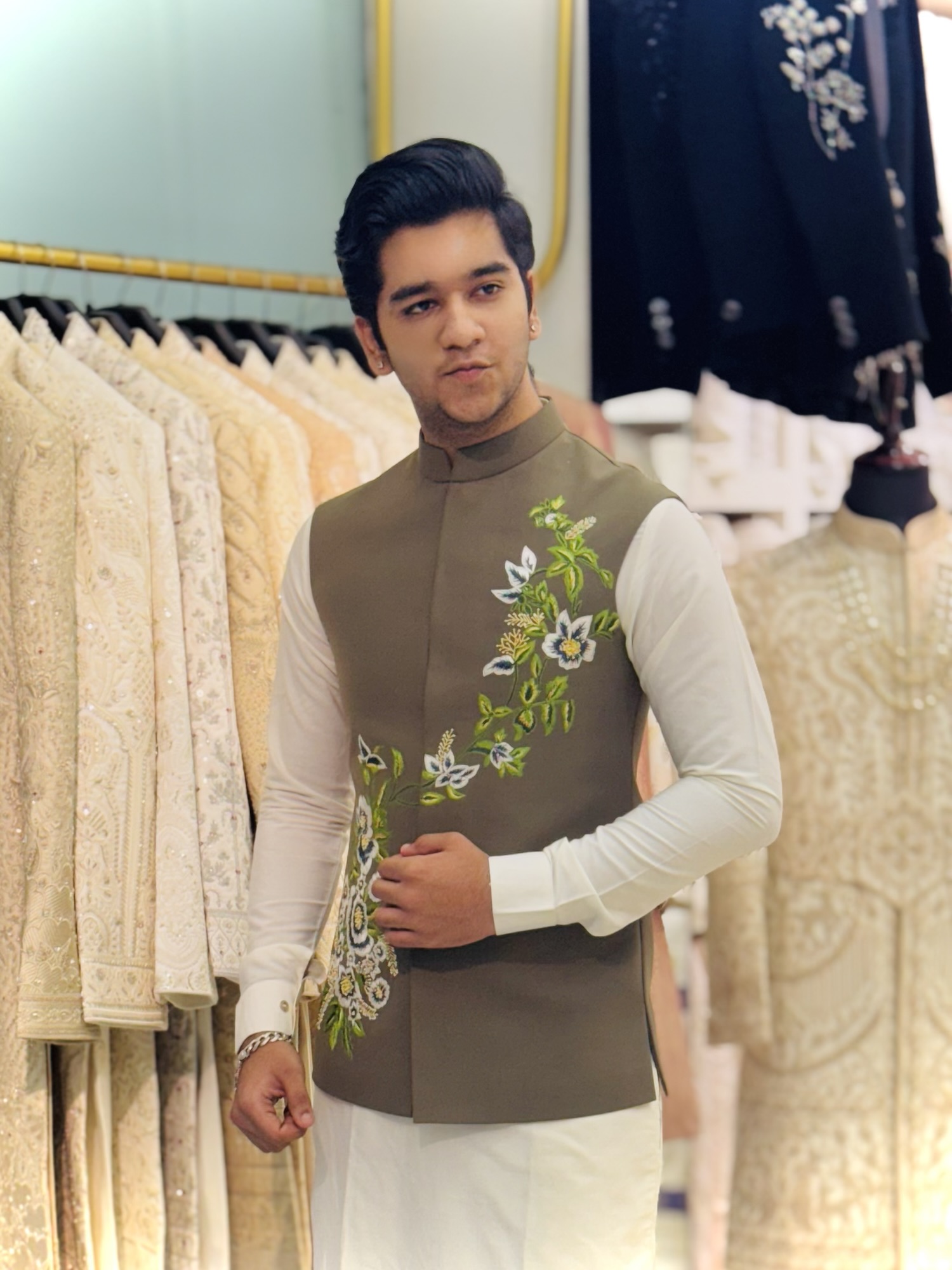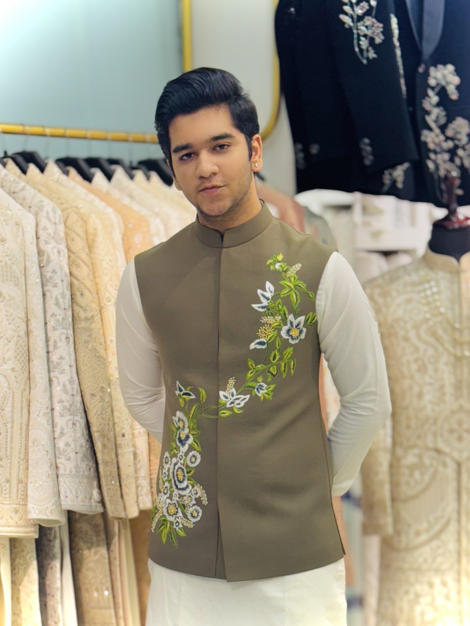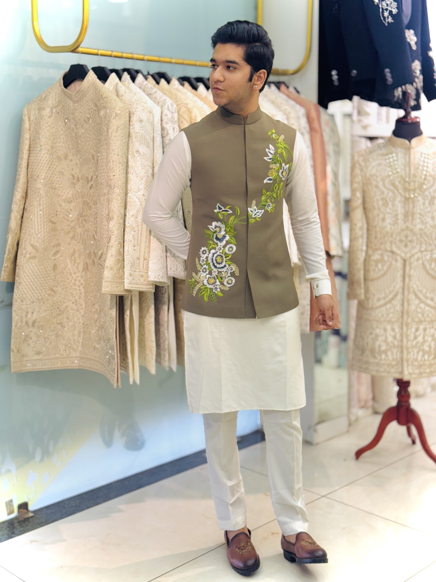 khakhi floral hand embroidered koti set