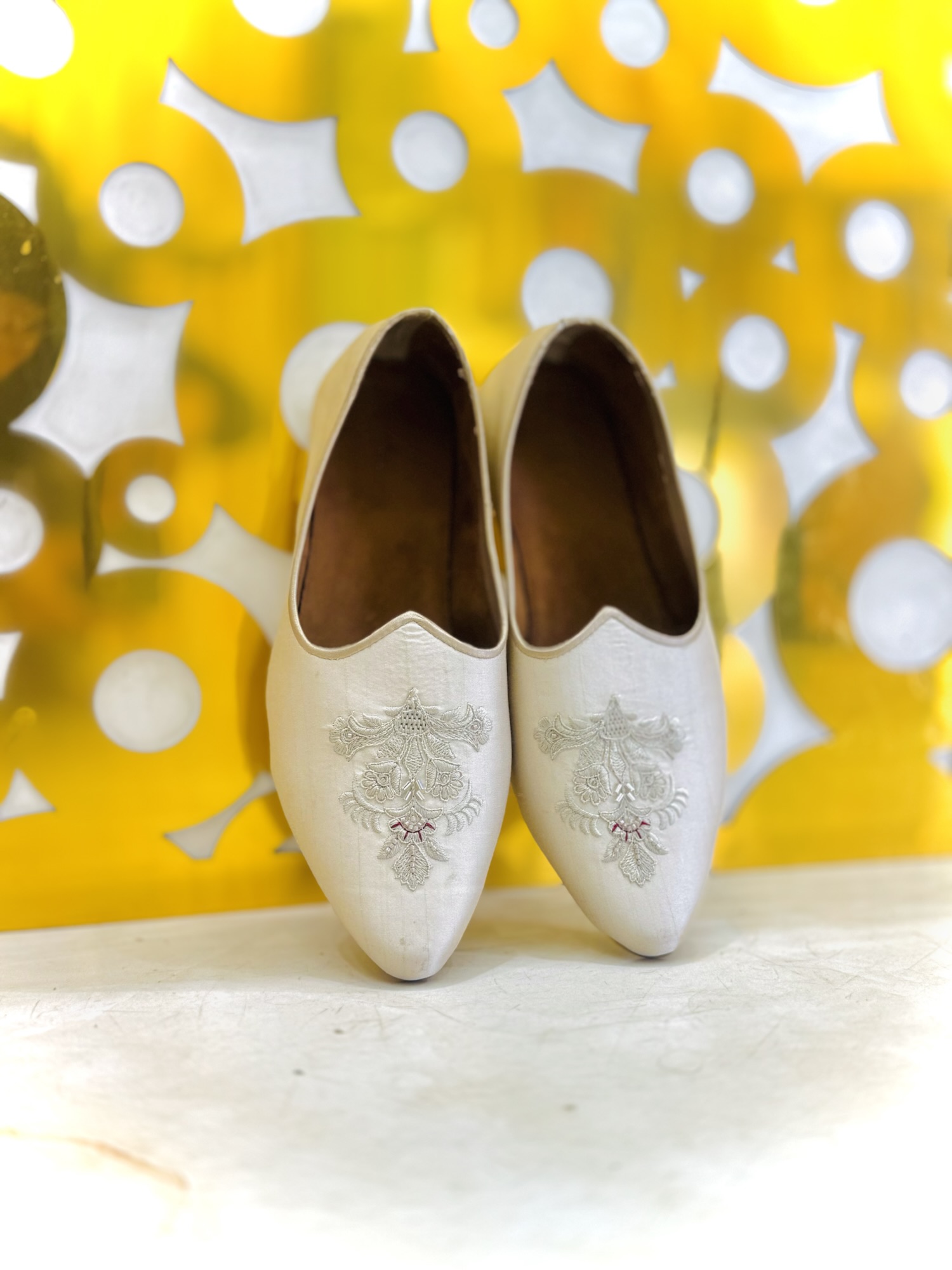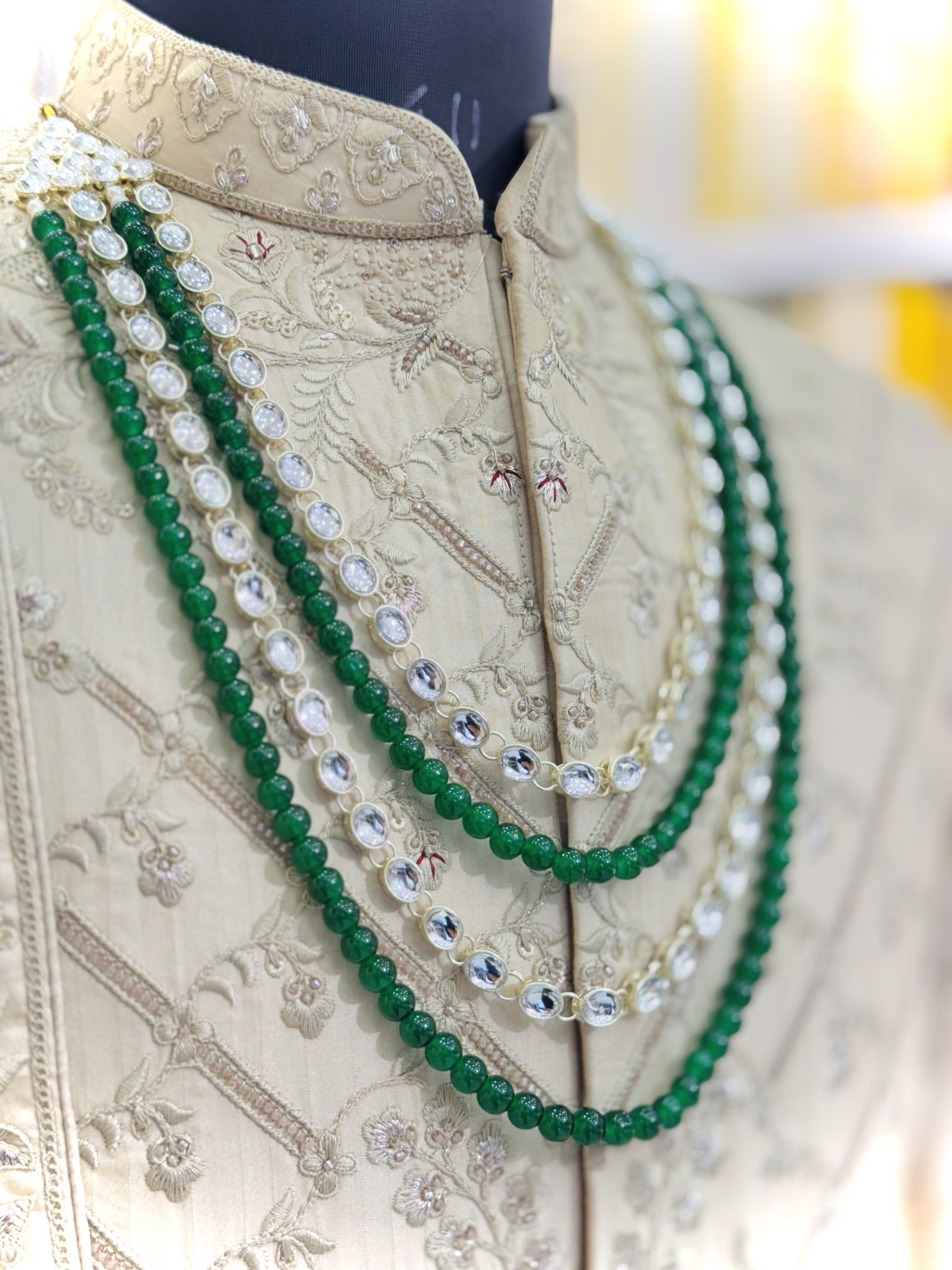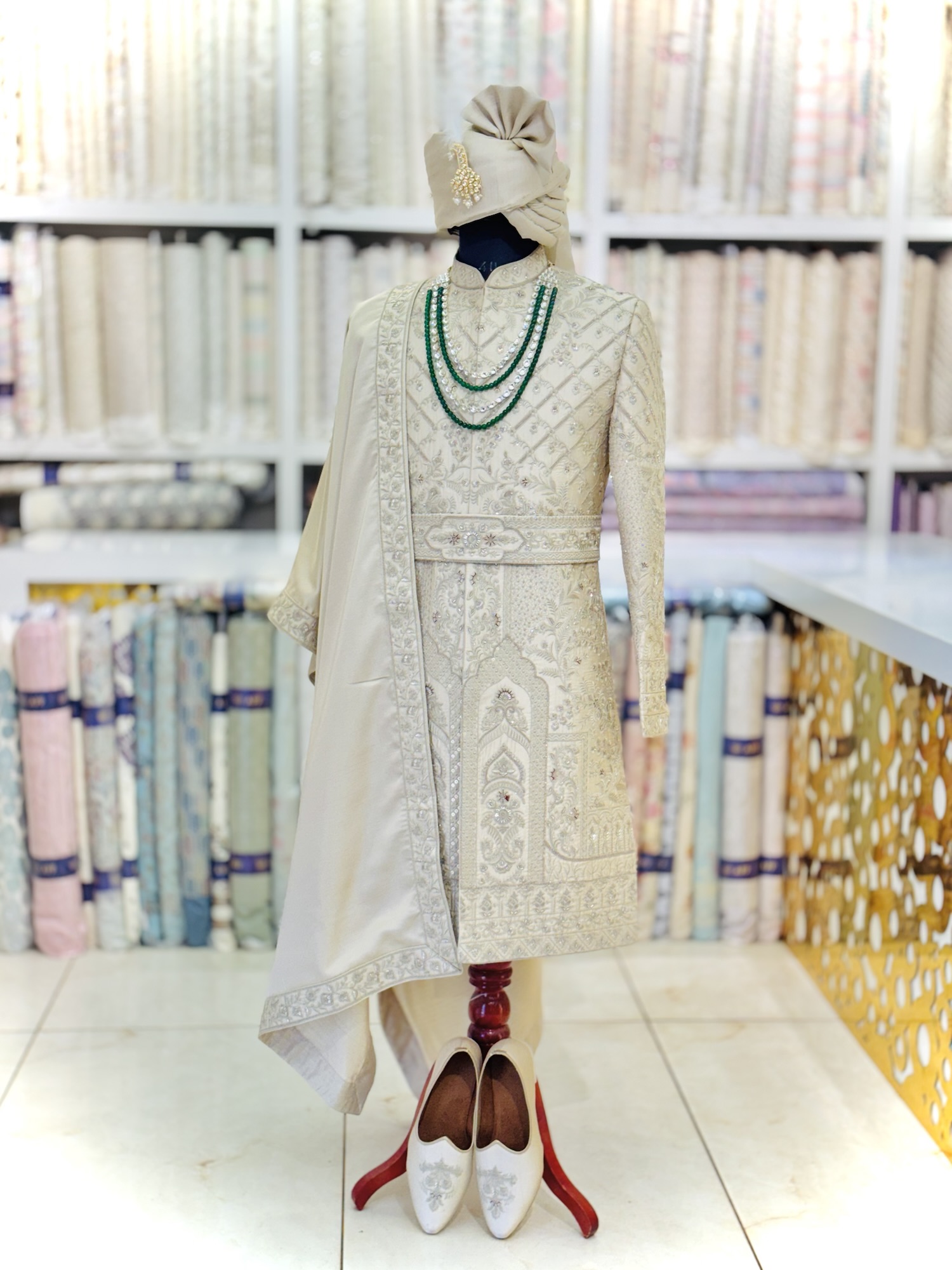 Material : embroidered sherwani , silk pajama , silk shawl , cotton silk safa , moti mala , embroidered mojdi .