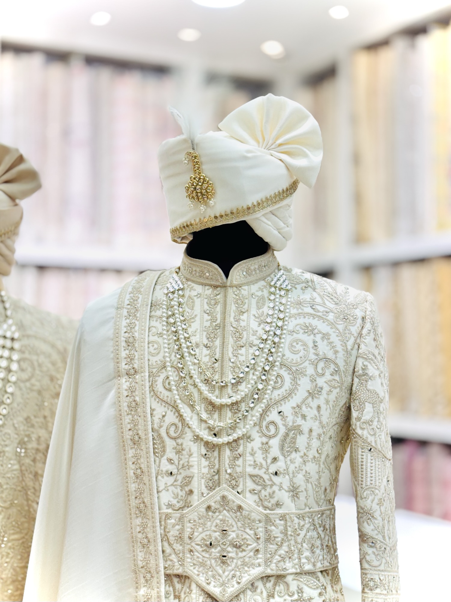 Included things : Sherwani , pajama , shawl , safa with brooch , mala , mojdi .